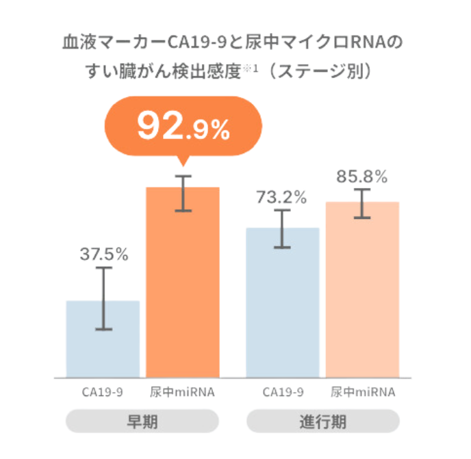 すい臓がんは早期発見が難しく、すい臓がんの検査、血液マーカーであるCA19-9の早期がん (ステージI/IIA)の感度は37.5%に対して、尿中マイクロRNA検査は感度92.9%です。