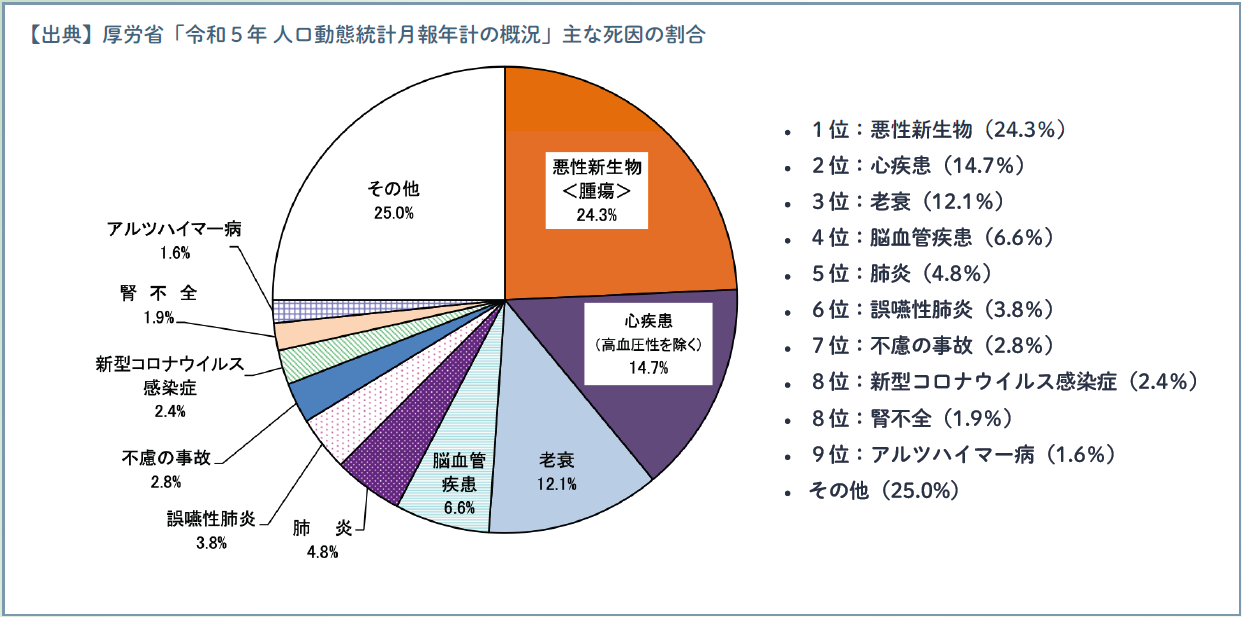 日本において、2023年の男女合わせた死亡数は157万5936人で、前年の156万9050人より6,886人増加しています。以下グラフは男女を合わせた死因の構成割合で、日本の3大死因は「1位:悪性新生物」「2位:心疾患」「3位:老衰」となっています。