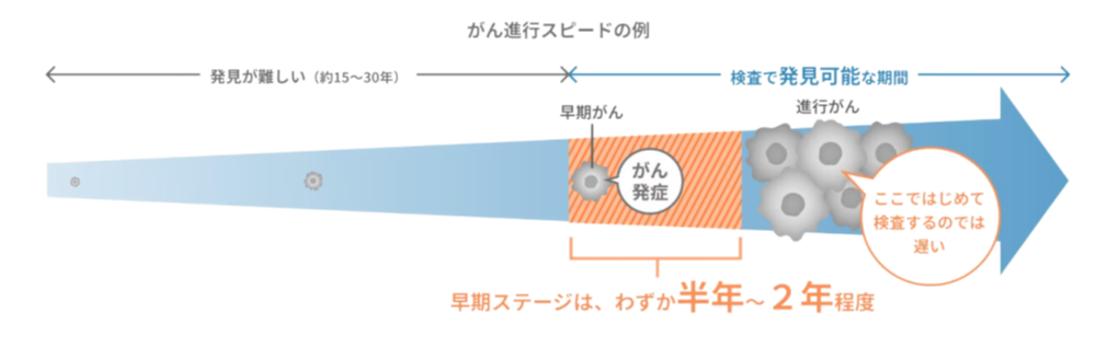 検査で発見可能な早期がんの期間は短く、がんによっては半年〜2年程度です。定期的に検査をすることで早期発見のタイミングを逃さないことが大切です。
